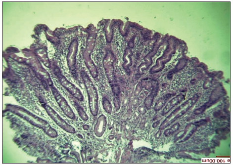 En bulbo duodenal y segunda porción del duodeno, se observó mucosa aplanada, compatible con EC, y se tomaron biopsias. En el estudio histológico, se observó una alteración moderada a severa de las vellosidades y linfocitosis intraepitelial (Figura 8), que se interpretaron como cambios vinculables a EC de grado 3B en la clasificación de Marsh Oberhuber. Se investigó la presencia de anticuerpos anti-transglutaminasa IGA, anticuerpos antigliadina IGA, IGG; todos con resultado positivo.