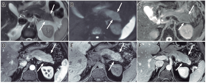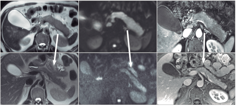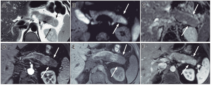 A nivel de la cola pancreática se observa una imagen focal mal definida hipointensa en T1 y discretamente hiperintensa en T2 y DWI, aunque sin restricción en ADC. La misma no realza con el contraste EV en fase arterial y muestra realce progresivo en fase portal, siendo más evidente en los cortes más tardíos (flechas).