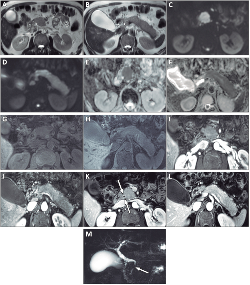 A-B) T2, C-D) difusión, E-F) mapa de ADC, G-H) T1, I-J) fase arterial, K-L) fase tardía, M) colangioRM.