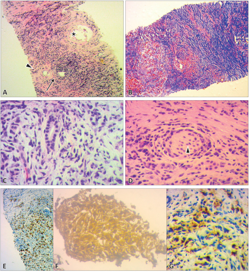 A: H&E 100X. Proceso inflamatorio mononuclear periductal (flecha). Daño vascular con esfacelo endotelial (estrella). Atrofia lobulillar. Arteriola adyacente a conducto pancreático interlobular (punta de flecha).