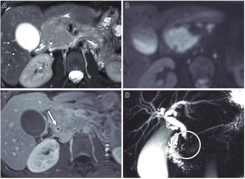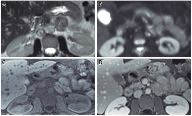 Se realizó resonancia magnética de abdomen con contraste, difusión y colangiopancreatografía, y se observó distensión vesicular y dilatación de la vía biliar intra y extrahepática (9 mm máximo) con estenosis progresiva hacia distal. La cabeza del páncreas presentaba una formación lobulada de 48 mm, levemente heterogénea en T1 y T2, con marcada restricción en difusión y escaso refuerzo no homogéneo, pero con realce marginal tardío. Dicha formación generaba una obstrucción del conducto pancreático, cuyo contorno era ligeramente irregular en el resto de la glándula. El páncreas corporocaudal presentaba tamaño disminuido. Además, se observaron pequeños ganglios peripancreáticos cefálicos (Figura 4).