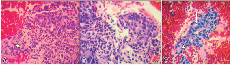 A y B: H&E 400X. Distorsión de la histoarquitectura lobulillar. Intenso infiltrado a predominio de neutrófilos. Ausencia de patrones de fibrosis parenquimatosa. Perineuritis (estrella).