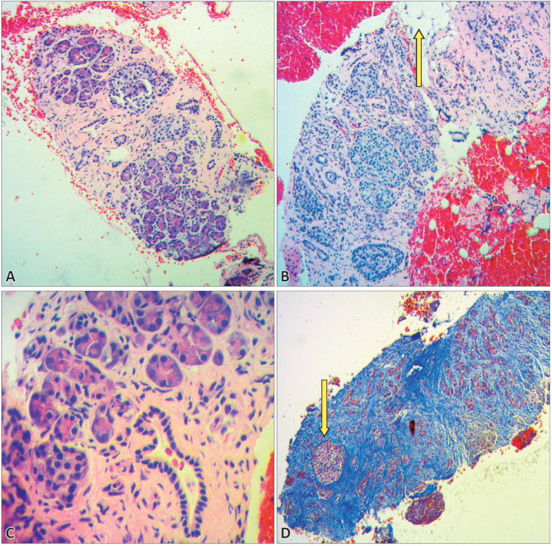 D: Tricrómico de Masson 100X. Patrón de fibrosis parenquimatosa. Hipertrofia de islote de Langerhans (flecha).