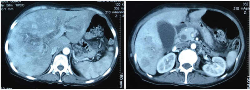 También fueron realizados estudios de imágenes. En la ecografía se reporta lóbulo hepático derecho de 180 mm, parénquima heterogéneo y ecogenicidad aumentada, vesícula de 4,5 cm, su pared de 5,3 mm, el barro biliar ocupa 40% de la luz y colédoco de 10 mm. En la tomografía espiral multicorte de abdomen completo con contraste, se describe: parénquima heterogéneo, presencia de imagen nodular en segmento II y una moderada dilatación de las vías biliares intra y extrahepáticas (Figuras 2 y 3).