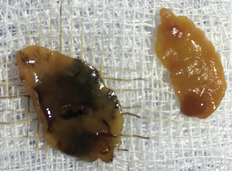 La sintomatología, aunque es variable, tiene dos etapas descritas. La primera etapa es la de infección aguda, que corresponde a la invasión hepática y dura hasta cuatro meses. El paciente suele ser asintomático o caracterizarse por la tríada de dolor en hipocondrio derecho o epigastralgia, fiebre continua y hepatomegalia dolorosa. Puede acompañarse de manifestaciones sistémicas, de las cuales no se conoce su mecanismo fisiopatológico, pero se plantea que pueden deberse a depósitos de inmunocomplejos circulantes; estas manifestaciones pueden ser: artralgias, mialgias, astenia, anorexia, adelgazamiento, síntomas de alergia –como prurito y urticaria–, sintomatología torácica –como derrame pleural–, tos seca con infiltrado pulmonar, síntomas cardíacos –como miocarditis o pericarditis– o manifestaciones neurológicas –como cefalea, meningoencefalitis y crisis convulsivas–. La segunda etapa es la etapa crónica, en la cual se encuentran la mayoría de los pacientes al momento del diagnóstico. Esta etapa continúa a las manifestaciones agudas; el paciente puede permanecer asintomático o, en caso contrario, presentar una clínica de obstrucción biliar, que puede ser parcial y cuyo síntoma característico es el dolor crónico en el hipocondrio derecho, que simula un cuadro de colecistitis crónica reagudizada. En cambio, si la obstrucción es completa, se presenta ictericia y se requiere CPRE de emergencia.4, 5 En algunos casos también hay manifestaciones de diseminación parasitaria extrahepática. Las manifestaciones extrahepáticas se dan por la migración ectópica del parásito, lo que puede producir infiltrado de eosinófilos y mononucleares y provocar daño tisular severo.6 El cuadro clínico del caso reportado es un cuadro de evolución crónica, similar a otro caso reportado anteriormente, de una mujer de 43 años con dolor abdominal recurrente, que tenía una historia de cinco años de colelitiasis sintomática, sin mejoría después de colecistectomía, y a quien, por medio de la colangiopancreatografía retrógrada endoscópica (CPRE) se le extrajo del colédoco un parásito vivo. Este fue confirmado, mediante patología, como Fasciola hepatica.7