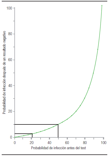 Sin embargo, es más útil calcular la probabilidad postest (P) positiva y negativa a partir del teorema de Bayes, el cual permite estimarlas a partir de la S y E del test y de la probabilidad pretest de la enfermedad. Al incorporar la probabilidad de tener la enfermedad antes de realizar el test se tiene en cuenta el contexto clínico en el que este se realiza. La probabilidad pretest (p) va a depender, como mencionamos, de los antecedentes del paciente, las manifestaciones clínicas y la prevalencia de la enfermedad en la población.