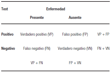 Al realizar un test diagnóstico vamos a encontrar cuatro situaciones posibles. Los verdaderos positivos (VP) son aquellos pacientes con la enfermedad en quienes el test es positivo. Los verdaderos negativos (VN) son aquellos pacientes sin la enfermedad en quienes el test es negativo. Los falsos negativos (FN) son aquellos con la enfermedad en quienes el test es falsamente negativo. Los falsos positivos (FP) son aquellos sin la enfermedad en quienes el test es falsamente positivo. Entonces, podemos definir la S como la probabilidad de encontrar un VP entre los pacientes que tienen la enfermedad (VP/VP+FP) y la E como la probabilidad de tener un VN entre aquellos que no tienen la enfermedad (VN/VN+FP) (Tabla 1).1