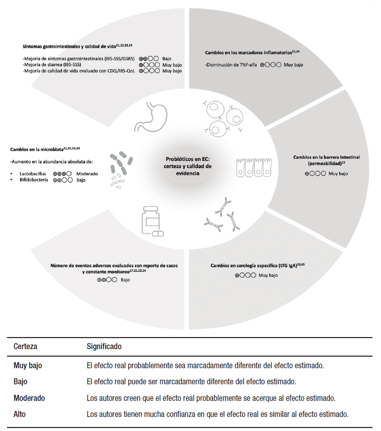 En conclusión, el uso de probióticos tendría un efecto beneficioso en la mejoría sintomática en la EC, y su administración demostró ser segura. Sin embargo, el grado de certeza de la evidencia actual es bajo, posiblemente relacionado con el bajo número de pacientes estudiados y la heterogeneidad en el diseño de las investigaciones. Por lo tanto, se necesitan estudios clínicos randomizados y controlados, con una muestra poblacional apropiada, y con un diseño riguroso que permitan evaluar el efecto de los probióticos sobre diferentes variables, incluyendo la mejoría de los síntomas intestinales y extraintestinales, la reducción de actividad de la EC, así como también el efecto en la mejoría de la calidad de vida de estos pacientes.
