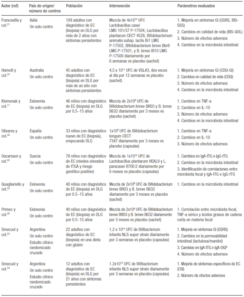 EC: enfermedad celiaca; DLG: dieta libre de gluten; UFC: unidades formadoras de colonias; CDV: calidad de vida; GI: gastrointestinal; GSRS: Gastrointestinal Symptoms Rating Scale; IBS: irritable bowel syndrome; IL: interleukina; NLS: Natren Life Start; QOL: Quality of Life; SSS: Symptom Severity Score; CDQ: score general; TNF-a: factor de necrosis tumoral alfa; tTG: transglutaminasa; DGP: péptidos deamidados de gliadina.