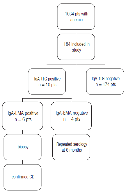 Other studies on the prevalence of CD in anemic patients have alternate results, with values ranging between 0 and 10.4%, as shown in studies performed in Iran and Turkey.30, 31 These differences with our study are probably explained by the regional peculiarities of each country and disparities in the diagnostic criteria used. Some studies consider biopsy to be the the gold standard method for diagnosing CD, even though they include IgA-tTG analysis but without IgA-EMA testing.