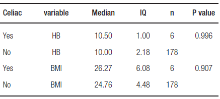 The Mann-Whitney test was performed and the p value of <0.05 was adopted for a significant association of hemoglobin, body mass index (BMI), and transglutaminase variables.