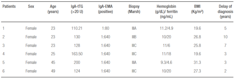 The most frequent symptoms reported by the six CD positive patients were headache (66.7%), abdominal pain (50%), and other gastrointestinal symptoms (flatulence, postprandial fullness, abdominal pain and, diarrhea) (33,3%). The median age of the patients diagnosed with CD was 24 years (range from 23 to 49 years), all of them female (100%). The mean duration of CD diagnosis among these 6 patients from the onset of anemic symptoms to gastrointestinal symptoms was 5 years. Hemoglobin and BMI of patients with and without CD revealed no significant differences (Table 1).