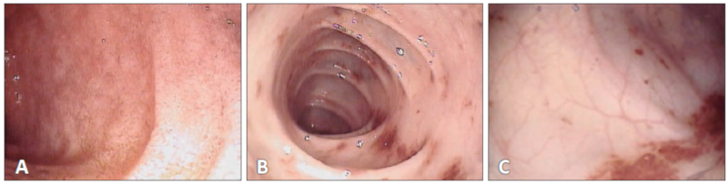 Paciente femenino de 8 años de edad, previamente sana, derivada a nuestra institución para estudio y tratamiento por cuadro de insuficiencia renal aguda (IRA) con hematuria, proteinuria y anticuerpos ANCA +. Como antecedente, seis meses previos a la consulta, presentó decaimiento, vómitos y disminución del ritmo diurético. Se realizan múltiples estudios, entre los que se destaca la presencia de anemia, hematuria, proteinuria y anticuerpos ANCA +, por lo que se deriva a un centro de mayor complejidad. Al ingreso se constata oligoanuria e hiperkalemia, por lo cual inicia hemodiálisis. Se realiza biopsia renal que informa glomeruloesclerosis (global y difusa), proliferación extracapilar y nefropatía intersticial aguda difusa. Inmunofluorescencia: pauci-inmune. De acuerdo con el informe histológico y las serologías, se confirma diagnóstico de MPA (vasculitis ANCA-p). Inicia tratamiento con tres pulsos de metilprednisolona, con posterior descenso de corticoides por vía oral, sumando además azatioprina y diálisis peritoneal. A las doce horas de su egreso, presenta un episodio de proctorragia abundante. Al examen físico se encuentra hemodinámicamente estable, con abdomen blando depresible e indoloro y cánula de diálisis peritoneal sin signos de flogosis. Región perianal sin lesiones. Dentro de los exámenes complementarios, se realiza ecografía de abdomen en la que se observa dilatación de asa colónica y escaso líquido libre en cavidad abdominal. Se efectúa hemograma con hemoglobina 8,5 g/dl y hematocrito 25%. La cánula de diálisis muestra líquido claro, sin evidencia de sangrado. Durante el transcurso de la internación se constata caída de cinco puntos del hematocrito, por lo que recibe transfusión de glóbulos rojos y se realiza endoscopía digestiva. Se constata nodularidad y disminución de pliegues en segunda porción duodenal. La videoendoscopía muestra a nivel del colon lesiones parcheadas de aspecto vasculítico y hematoma de pared a 55 cm del margen anal (Figuras 1 y 2).