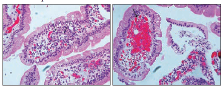 Por sospecha de compromiso gastrointestinal secundario a vasculitis se realizan biopsias, que son enviadas a anatomía patológica. Estas se realizan en forma escalonada de los sectores evaluados, siendo dirigidas en presencia de lesiones sugestivas. El procedimiento es bien tolerado por la paciente y sin complicaciones. En una de las muestras de duodeno se reconoce congestión vascular con extravasación eritrocitaria focal y vasculitis focal de vasos capilares (Figura 3). La muestra colónica presenta histoarquitectura glandular conservada, hallándose un foco sospechoso de inflamación perivascular con eosinófilos. Ante el hallazgo de compromiso extrarrenal de vasculitis activa, se suspende azatioprina y se inicia ciclofosfamida. Evoluciona en forma favorable, con posterior egreso hospitalario, y continúa controles ambulatorios con reumatología, nefrología y gastroenterología en nuestra institución.