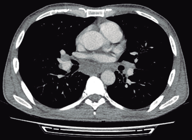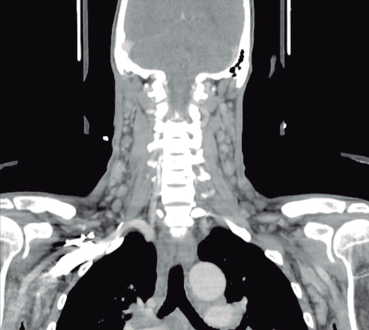 En una tomografía computarizada de cerebro, cuello, tórax, abdomen y pelvis con contraste oral y endovenoso se observaron múltiples ganglios en las mismas regiones que al examen físico y en mediastino e hilios pulmonares, con conglomerados, sin otros hallazgos relevantes. Figura 1 y Figura 2.