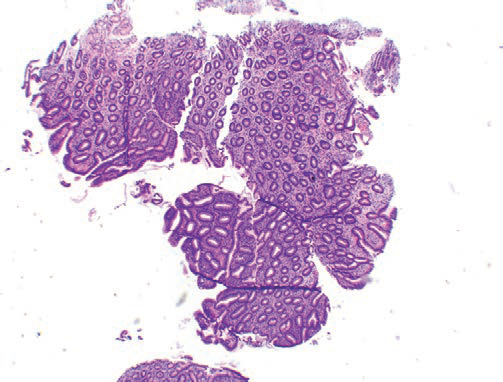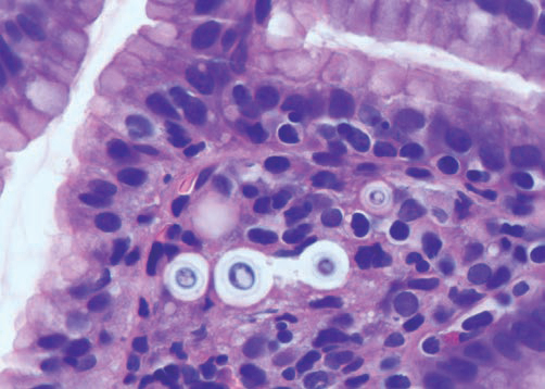 Dada la persistencia de la intolerancia digestiva y el deterioro del estado general del enfermo, se efectuó una esofagogastroduodenoscopía que mostró mucosa gástrica con patrón de mosaico y gastropatía no erosiva (Figura 3). Se tomaron muestras para biopsias que informaron una gastritis con cambios reactivos del epitelio foveolar, un leve infiltrado inflamatorio predominantemente mononuclear, y presencia de elementos micóticos levaduriformes, encapsulados, de forma redondeada, de 3,5-8 µm, con una gruesa cápsula que fue positiva con metenamina-plata, ácido periódico de Schiff (PAS) y mucicarmín. (Figura 4 y Figura 5).