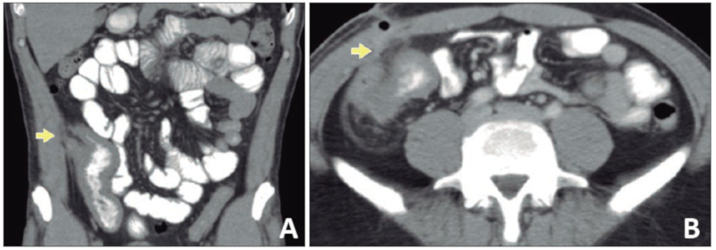 During physical examination, palpation of the abdomen revealed a mass of a complex and painful consistency adhered to deep planes in the right iliac fossa, without peritoneal irritation or palpable adenopathies. Based on the clinical data of the history and the physical examination, it was decided to perform a colonoscopy and an abdominal computed axial tomography (CT) scan.