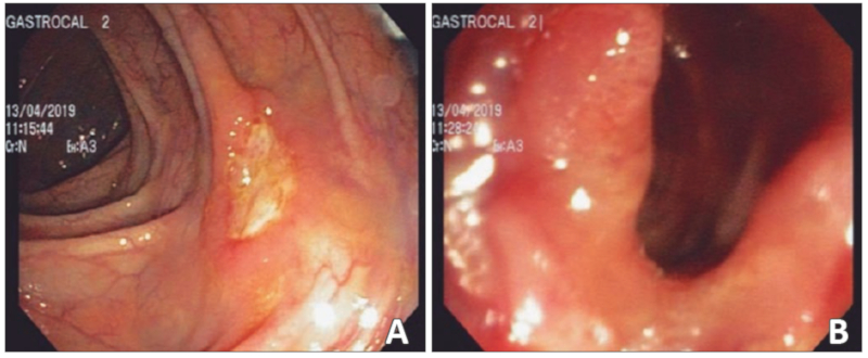 A 39-year-old man from a rural area of Colombia attends a gastroenterology consultation, due to recurrent abdominal pain associated with liquid stools that alternated with episodes of constipation in the last three years. The patient also reported a loss of 30 kg in the same period. In addition, over the previous six months, the pain was predominantly located in the right iliac fossa with subjective mass sensation at that level. The patient did not report episodes of fever, night sweats, lymphadenopathy, cough or other symptoms. His history included chronic antral gastritis with positive H. pylori, for which he underwent eradication therapy without improvement of the symptoms. Among the laboratory tests performed before the consultation in our medical center, only mild anemia was reported. The blood count did not show leukocyte and platelet alterations. HIV, Hepatitis B, and Hepatitis C serologies were negative. A chest x-ray was unremarkable.