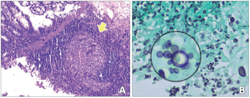 Abdominal CT showed thickening of the walls of the distal ileum at the level of the ileocecal valve, with inflammatory changes in the adjacent fat, and the presence of a fistulous tract with gas that extended to superficial planes (Figure 1). Endoscopic findings revealed erythema and edema with thickening and congestion of the mucosa of the distal ileum, together with ulcerations with a whitish background. Thickening, edema and erythema of the mucosa were also evidenced in the cecum and ileocecal valve. Finally, an ulcer lesion with a whitish background was found in the ascending and transverse colon (Figure 2). Multiple biopsies were taken, and the histopathological study found chronic and necrotizing granulomatous disease secondary to fungal infection with yeasts morphologically compatible with paracoccidioidomycosis (Figure 3).