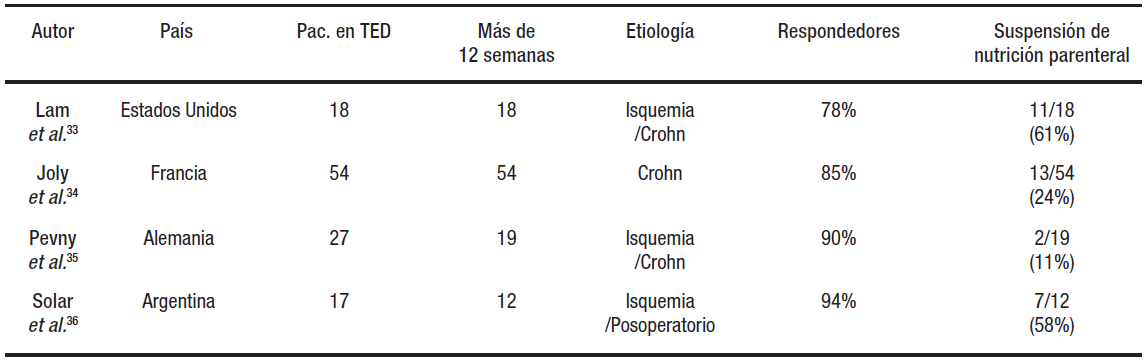Los resultados obtenidos con el uso de TED, y reportados por programas multidisciplinarios especializados en el manejo de estos pacientes, han demostrado que el tratamiento protocolizado, sumado a la experiencia y el criterio médico son factores fundamentales para obtener resultados favorables. En la Tabla 1 se presentan los resultados de cuatro centros con experiencia en el manejo de pacientes con FI y SIC.