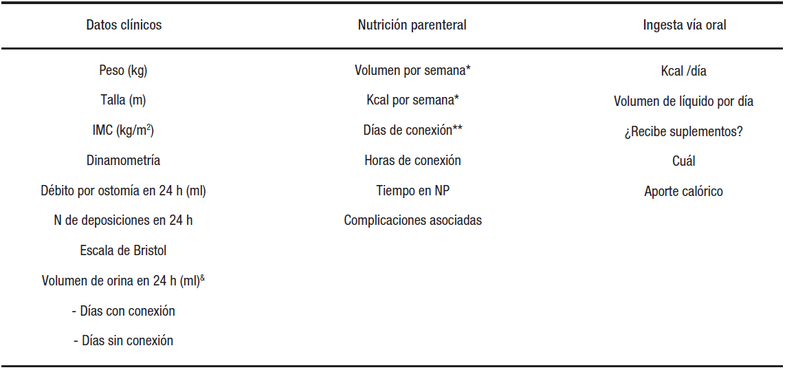 Anatomía tipo 1: alto débito por ostomía. Desnutrición, deshidratación, alteraciones electrolíticas severas, anemia e hipovitaminosis por déficit de vitaminas B12 y liposolubles secundarias a la pérdida de péptidos y enterohormonas producidas en el íleon distal y el colon proximal. Disminución de la producción de ácidos grasos de cadena corta, menor recuperación de energía y menor absorción de agua y electrolitos, con alta dependencia a la NP.