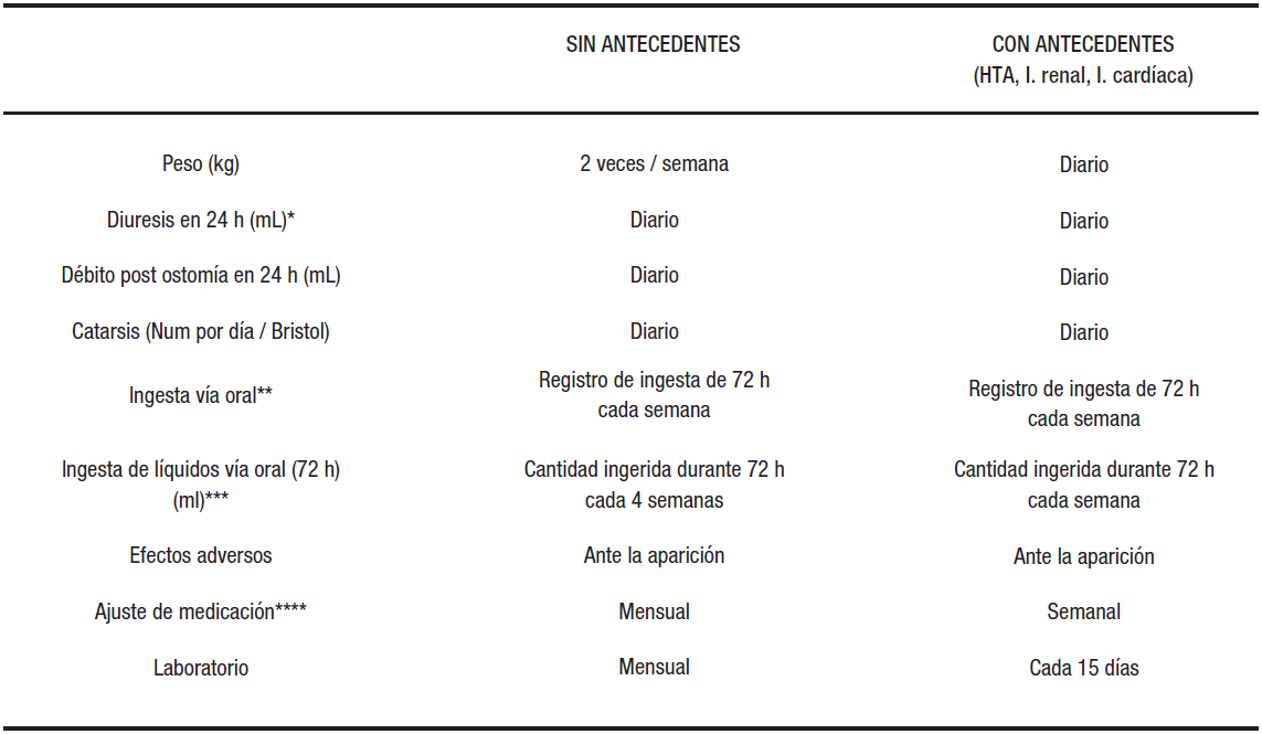 Esta valoración y cambios en la composición de la bolsa de NP se harán cada 3-4 semanas según el criterio médico.