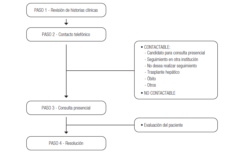 Se diseñó un esquema simplificado de cuatro pasos (Gráfico 1) que permitió disminuir el número de consultas presenciales, que consta de: PASO 1: búsqueda y selección de historias clínicas manuscritas catalogadas como "hepatitis C" archivadas en la Sección de Hepatología. PASO 2: llamada telefónica al número de contacto registrado en la historia clínica, clasificando a los pacientes en "contactables" o "no contactables", según se haya logrado o no establecer comunicación. A los "contactables", se les realiza un interrogatorio dirigido para subclasificarlos en "candidato a consulta presencial", "no desea realizar seguimiento", "en seguimiento en otra institución", "trasplantado" u "óbito". PASO 3: consulta presencial de los "contactables" subclasificados como "candidato a consulta presencial", en la que se realiza examen físico y actualización de estudios complementarios, según las recomendaciones de las guías para el manejo de pacientes con hepatitis C6-7 y cirrosis.8 A aquellos pacientes que no cuentan con carga viral de VHC previa, se les realiza durante la misma consulta una toma de sangre periférica para confirmar la presencia de anticuerpos anti-VHC y, ante un resultado reactivo, se deriva una muestra al Instituto Malbrán para determinación de viremia y genotipo (determinación cuantitativa y genotipificación de ARN de VHC por PCR real time), como parte del protocolo de test reflejo. PASO 4: resolución del caso (Gráfico 2), que consiste en el análisis de la información recolectada durante el interrogatorio, el examen físico y la interpretación de los exámenes complementarios realizados. En los casos con confirmación diagnóstica de hepatitis crónica C no tratada o de falta de respuesta al tratamiento previo (VHC RNA detectable), inicialmente se define el estadio de fibrosis hepática. Para ello, se utilizan métodos no invasivos como los test serológicos (APRI, FIB-4), la elastografía hepática (FibroScan, ARFI), la biopsia hepática o el criterio clínico (hipertensión portal, antecedente de cirrosis descompensada). La definición final del estadio de fibrosis se realiza tomando en cuenta las determinaciones más actualizadas o más representativas disponibles en cada caso, según el criterio del equipo médico tratante. Una vez definido el estadio de fibrosis se realiza la solicitud de tratamiento antiviral a la cobertura médica o al Ministerio de Salud, según corresponda, continuando el control correspondiente hasta su finalización. A los pacientes tratados (previamente o durante el programa), se les realiza el seguimiento hasta la confirmación de la respuesta viral sostenida en la semana doce postratamiento (RVS 12). En los casos de pacientes que alcanzaron la RVS 12 y presentan estadio de fibrosis F1 o F2 continúan seguimiento con clínico. Los pacientes con RVS y fibrosis avanzada o presenten alguna hepatopatía asociada (consumo alcohol, MAFLD, depósito de hierro, etc.), se vincula al paciente con un médico de staff referente para continuar el seguimiento.