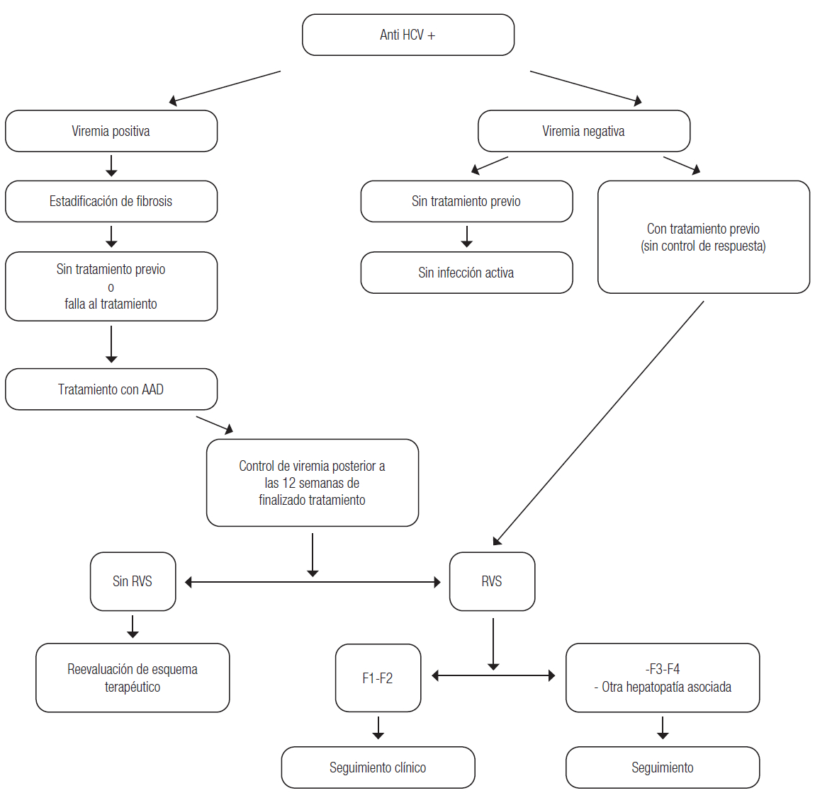 HCV: Virus hepatitis C. AAD: antivirales de acción directa. RNA HCV: ARN Virus hepatitis C. RVS: respuesta viral sostenida. F3-F4: fibrosis grado 3-4.