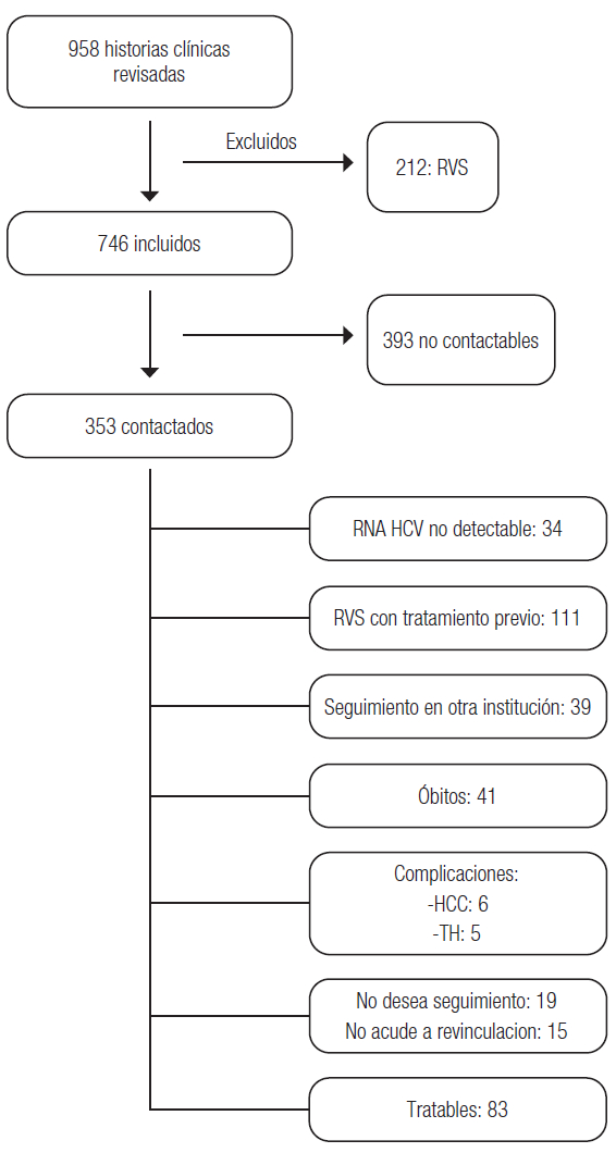 Se incluyó a pacientes mayores de 18 años, que no habían tenido seguimiento médico durante el año previo al inicio del enrolamiento y que cumplían con alguno de los siguientes criterios: anti-VHC positivo, viremia detectable (determinación cuali o cuantitativa de ARN de VHC por PCR real time) sin tratamiento previo, pacientes con tratamiento antiviral previo sin criterio de respuesta viral sostenida (quienes presentan carga viral positiva luego del tratamiento antiviral o quienes no realizaron control de viremia posterior para evaluación de respuesta viral sostenida) y pacientes con fibrosis avanzada (F3-F4) secundaria a VHC, con y sin tratamiento previo.