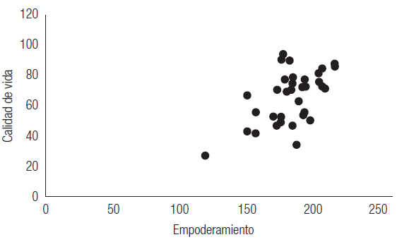 Existe una relación moderada positiva entre el empoderamiento y la CV de las personas adultas con EC en El Salvador (rho = 0,444; p = 0,007) (Figura 1).