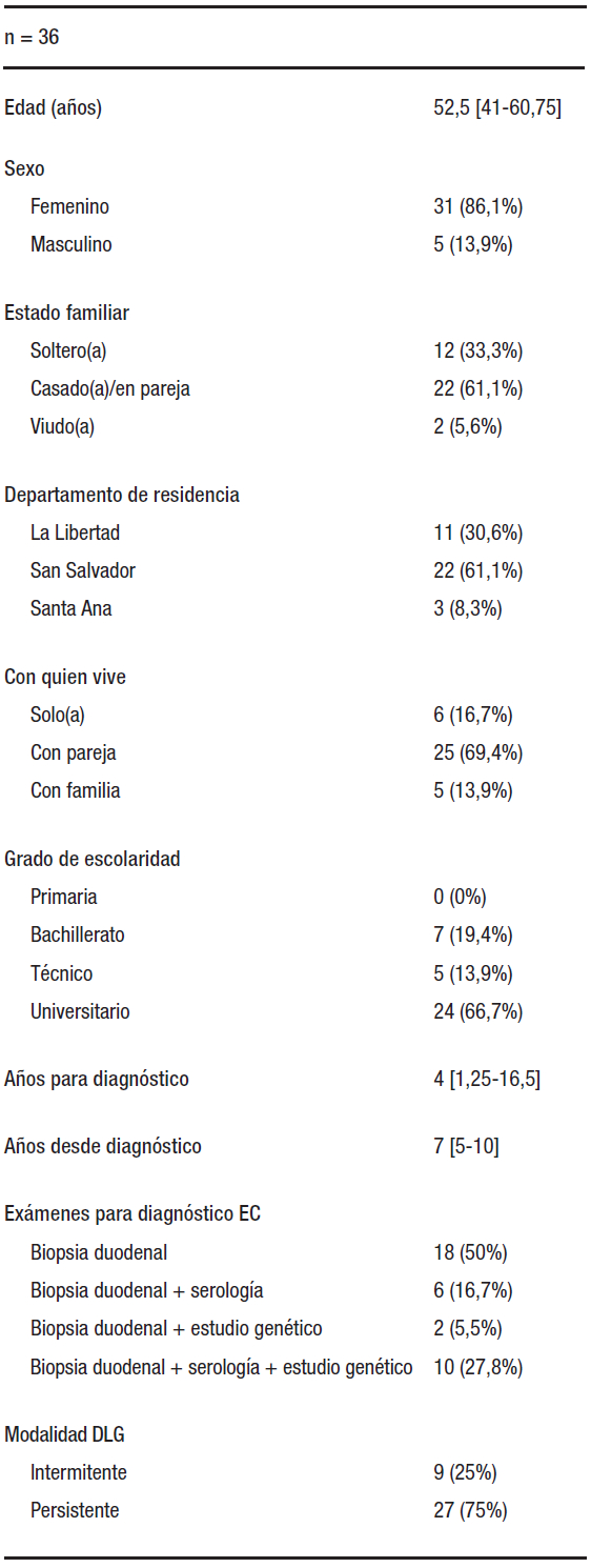 Se trata de un estudio descriptivo de corte transversal, con una recolección prospectiva de los datos. Se incluyó a pacientes con EC confirmada mediante biopsia duodenal, mayores de 18 años, de nacionalidad salvadoreña, que fueron invitados a participar por la Asociación de Celíacos y Sensibles al Gluten de El Salvador y aceptados tras cumplimentar el consentimiento informado. No se requirió el estudio serológico como criterio de inclusión porque no es un estándar aplicado en el sistema público sanitario salvadoreño.