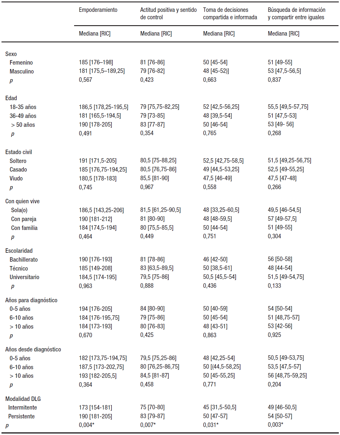Con respecto al empoderamiento, se obtuvo una puntuación mediana de 185,0 (176,25-195,0) sobre un total de 235 puntos. Estableciendo una categorización del nivel de empoderamiento análoga a la que se emplea en el cuestionario CD-QOL, se distingue entre un nivel de empoderamiento malo (0-117 puntos), regular (118-164 puntos) o bueno (165-235 puntos). De acuerdo con esta categorización, el 13,89% de las personas mostró un nivel regular de empoderamiento (151,0 [135,5-157,5]), todas mujeres, y el 86,11% mostró un nivel bueno de empoderamiento (188,0 [179,0-198,0]). Ninguna de las personas encuestadas presentó un nivel malo de empoderamiento. Solo el grado de adherencia a la DLG mostró relación con el nivel de empoderamiento (p = 0,004) (Tabla 2).