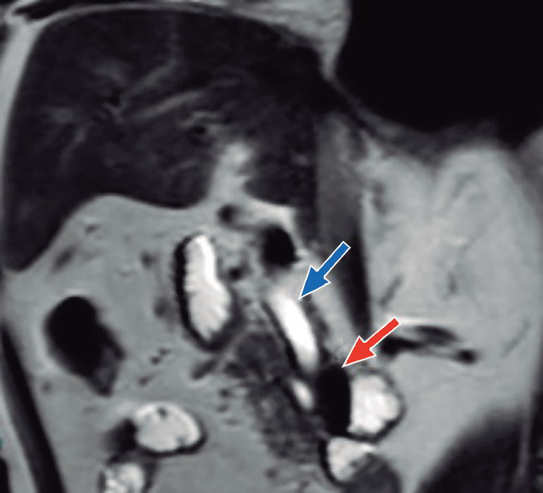 Paciente varón de 82 años, admitido en el servicio de emergencias del hospital, con un tiempo de enfermedad de dos semanas de evolución, caracterizado por dolor abdominal en el cuadrante superior derecho (CSD), fiebre e ictericia en escleras. En la exploración física se destacó la presencia de ictericia en escleras y la presencia de dolor a la palpación en CSD, con signo de Murphy negativo. Los análisis de laboratorio mostraron: recuento de leucocitos 18.7x109/L con 8% de abastonados, proteína C reactiva (PCR) 6,54 mg/dl, bilirrubina total 4,74mg/dl (bilirrubina directa 2,48mg/dl), TGO 382 U/L, TGP 377 U/L, fosfatasa alcalina 167 U/L, gamma-glutamil-transpeptidasa 1044 U/L y albúmina 2,7g/dl. La CPRM reveló una dilatación del conducto biliar común y del conducto pancreático principal a nivel de la cabeza del páncreas, sin evidencia de lesiones, y un divertículo de 23 x 21 mm a nivel de la segunda porción duodenal. No se observó dilatación de la vía biliar intrahepática ni evidencia de litos en la vía biliar o en la vesícula biliar (Figura 1).