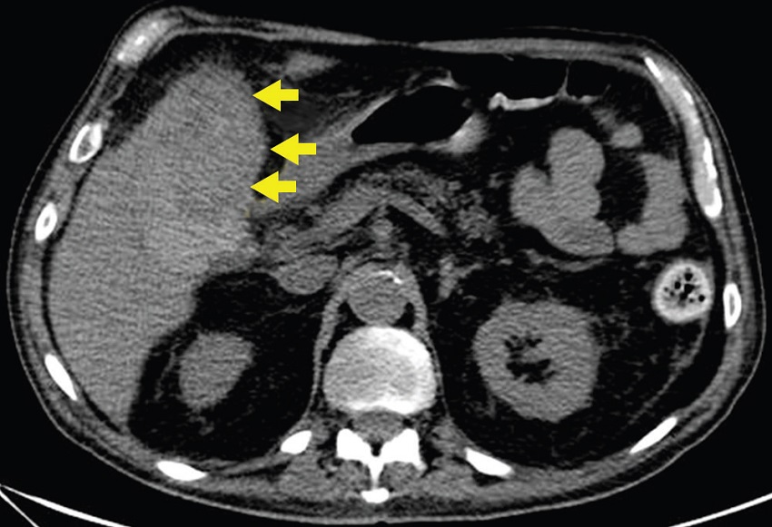 TCMD sin contraste endovenoso donde se visualiza la vesícula biliar distendida, con contenido espontáneamente hiperdenso heterogéneo (flechas amarillas).