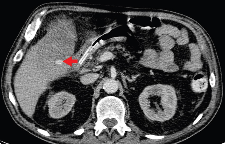 TCMD con contraste endovenoso, fase arterial. Se visualiza como área hiperdensa en el interior de la vesícula, en relación a fuga de contraste con sangrado activo (flecha roja).