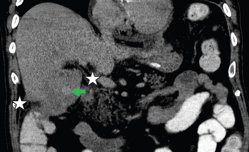 TCMD con contraste endovenoso, fase venosa. Vesícula biliar distendida con área hiperdensa en su interior en relación a fuga de contraste con signo de sangrado activo (flecha verde) y rarefacción de la grasa adyacente (estrella).