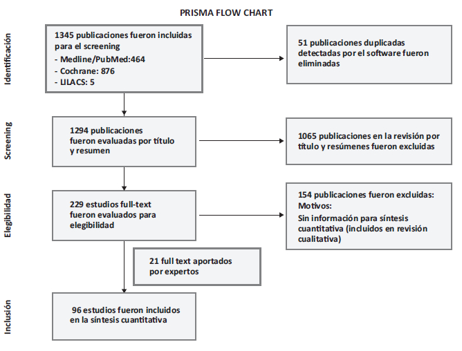 Se exportó cada carpeta creada en RevMan software al GRADE software20 para la creación de las tablas con el resumen de la evidencia. La evaluación de la calidad fue evaluada y realizada por dos evaluadores independientes, siguiendo los estándares de GRADE. Los conflictos fueron resueltos por consenso. La evaluación para cada outcome incluyó el análisis de los siguientes ítems: riesgo de sesgo, posibilidad de sesgo de publicación, inconsistencia, incongruencia en dirección de la evidencia e imprecisión. La metodología GRADE diferencia cuatro niveles de calidad, basados en el grado de confianza que la medida de efecto alcanza, luego del análisis de los estudios agrupados. Por este motivo, la calidad de la evidencia final de cada outcome es alta, moderada, baja o muy baja. Ante la ausencia de evidencia o cuando esta solo fue obtenida a través de opinión de expertos, el outcome fue catalogado como de calidad muy baja. Además, a los estudios diagnósticos se les hizo la evaluación de calidad según el instrumento QUADAS 2. (21 Se adjunta el diagrama de flujo considerando el PRISMA22 para el reporte de pasos de la revisión sistemática (Figura 1).