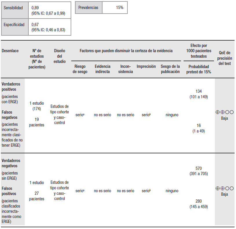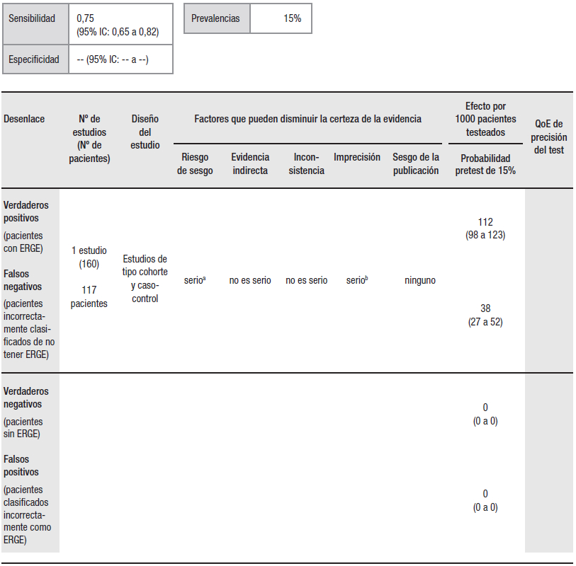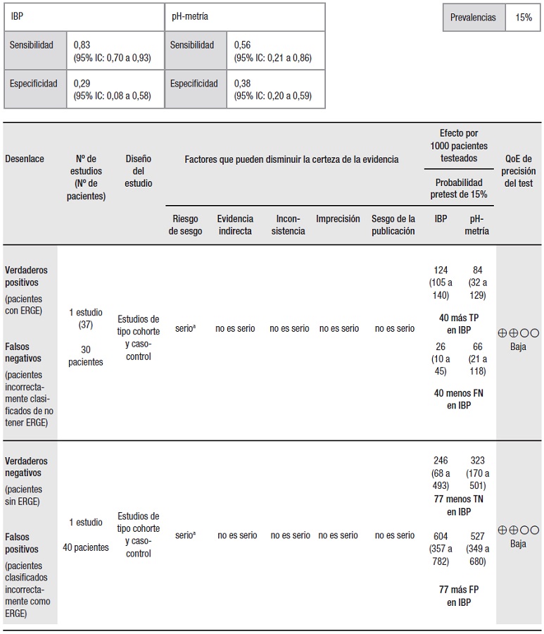 El análisis cuantitativo (Tabla 2) se realizó sobre la base de un estudio. (37 Considerando una prevalencia de ERGE del 15%, se calculó una sensibilidad del 86% (IC 95% 70-93) y una especificidad del 29% (IC 95% 8-58) para la prueba empírica con IBP, en comparación con el TEA. El estudio analizado es un ensayo clínico doble ciego, aleatorizado y controlado con placebo, en el que se evaluó la precisión diagnóstica de la prueba con omeprazol a altas dosis para la detección de la ERGE. En este sentido, se incluyó a 43 pacientes con al menos tres episodios de pirosis por semana durante al menos los últimos tres meses, a los que se les realizó EGD y pH-metría de 24 horas. Se midió la respuesta al omeprazol versus el placebo en pacientes con ERGE positivo y ERGE negativo, definido como la presencia de esofagitis erosiva en la EGD o una pH-metría anormal. De los 42 pacientes que completaron el estudio, 35 (83%) fueron clasificados como ERGE positivos y 7 (17%) como ERGE negativos. Veintiocho pacientes de los ERGE positivos y 3 de los negativos respondieron al test de omeprazol, resultando en una sensibilidad del 80% (IC 95% 66,7-93,3) y una especificidad del 57,1% (IC 95% 20,5-93,8).37 Hay que tener en cuenta que este análisis fue realizado sobre la base de un único estudio, con un tamaño muestral pequeño, por lo que nos encontramos con un nivel de imprecisión elevado.