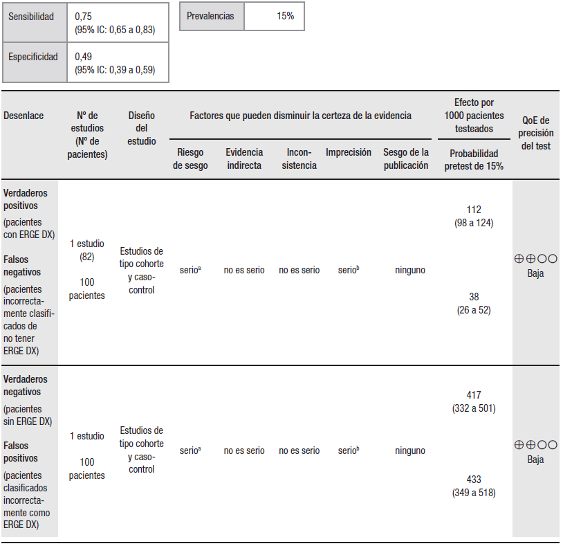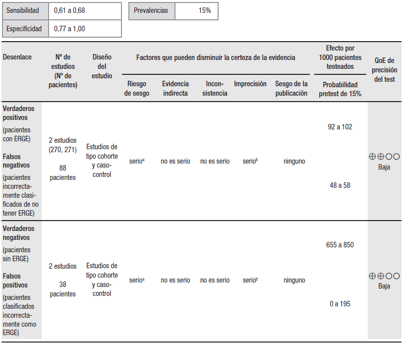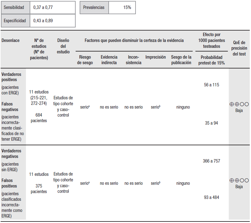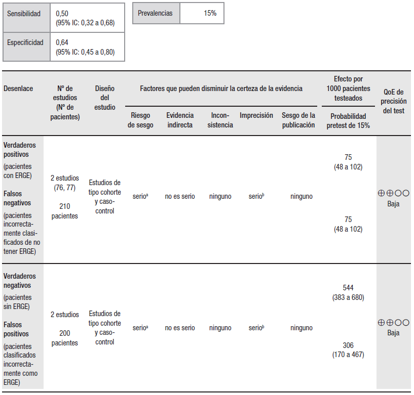 En el análisis cuantitativo, la calidad de la evidencia de los 10 estudios incluidos resultó baja (Tabla 17). Existe un riesgo de sesgo elevado, ya que los investigadores no estaban “ciegos” para el resultado de la prueba en comparación. En su mayoría, los investigadores que realizaron la prueba de pepsina en saliva fueron los mismos que realizaron la prueba considerada estándar de oro. Los resultados de los diferentes estudios muestran rendimientos diagnósticos variables (una sensibilidad que oscila entre 37%-77% y una especificidad de entre 43%-89%), lo cual disminuye la precisión de los resultados obtenidos.