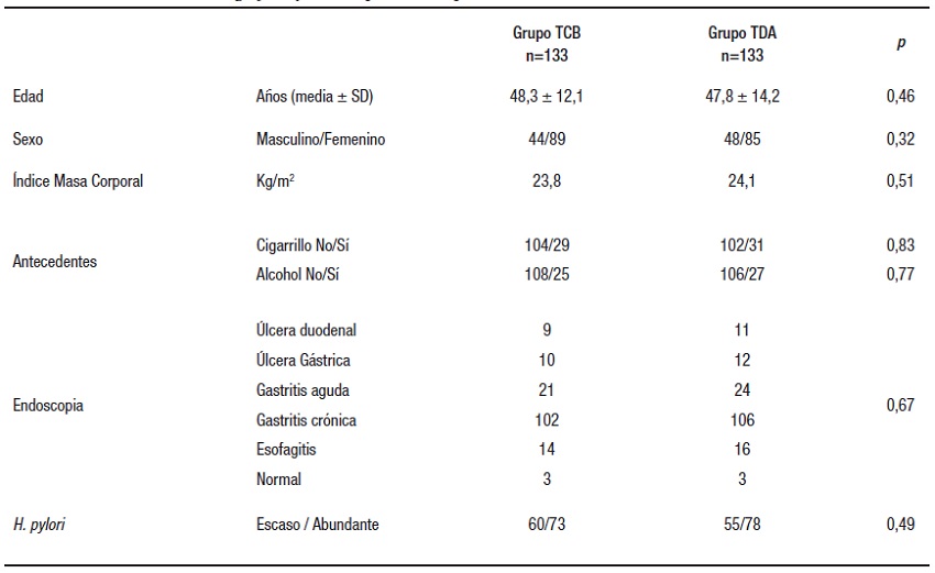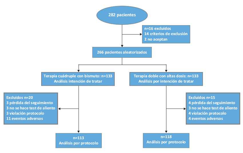 Se evaluaron 282 pacientes para el estudio, de ellos 14 presentaron criterios de exclusión (8 por haber recibido terapia en el último mes con IBP, 2 por haber recibido terapias previas para H. pylori, 2 por alergia a la penicilina, 1 por enfermedad maligna intercurrente, 1 por gastrectomía previa) y 2 no aceptaron participar. En total 266 pacientes fueron asignados al azar al grupo de TDA (n = 133) o al grupo TCB (n = 133). Todos los participantes fueron incluidos en el análisis por intención de tratar (ITT). El diagrama de flujo del estudio se presenta en la Figura 1.