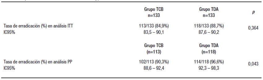En cuanto a la eficacia, los resultados de este estudio mostraron que la tasa de erradicación por ITT fue del 84,9% para la TCB y 88,7% para la TDA (p = 0,36), mientras que la tasa de erradicación PP fue del 90,3% y 95,7% en los grupos con TCB y TDA respectivamente, significativamente mayor para la TDA (p = 0,04), lo que coincide con lo reportado en los últimos metaanálisis que la comparan con otras terapias de primera línea. (15,29