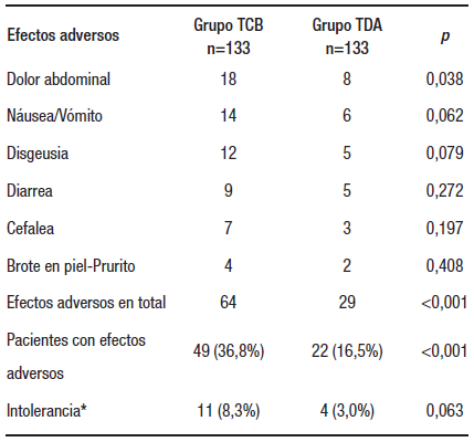 Las tasas de eventos adversos fueron del 16,5% en el grupo TDA y del 36,8% en el grupo TCB (p < 0,01) (Tabla 3). Estos efectos adversos incluyeron dolor abdominal, náuseas y vómitos, disgeusia, diarrea, cefalea, y prurito y/o erupción cutánea. En un grupo de pacientes perturbaron notablemente las actividades diarias, lo que motivó la suspensión de la terapia, con una tasa de intolerancia del 3% para el grupo con TDA y del 8,3% en el grupo con TCB (p = 0,06).