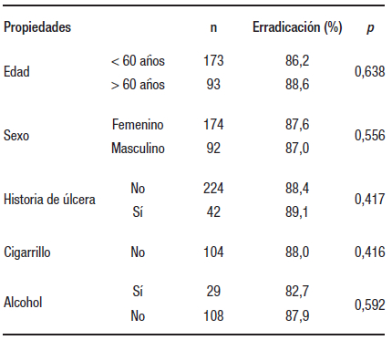 Como se muestra en la Tabla 4, el análisis univariado mostró que no había ningún factor clínico significativo que influyera en la eficacia del tratamiento de erradicación del H. pylori.