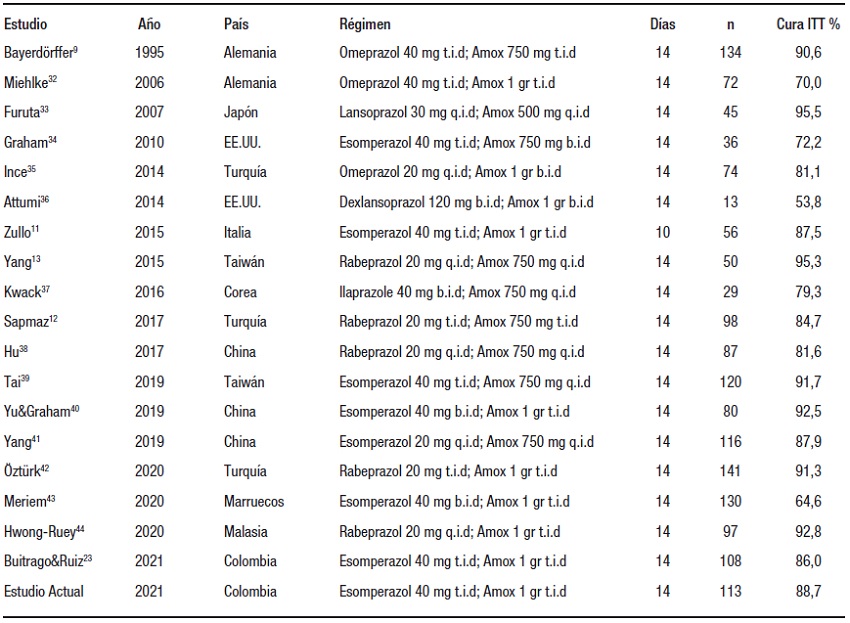 El interés por la terapia dual como tratamiento de primera línea se revitalizó en la última década; los datos están resumidos en la Tabla 5. No fue posible realizar un análisis de datos agrupados fiable debido a que se probaron diferentes IBP, dosis y duración de la terapia.