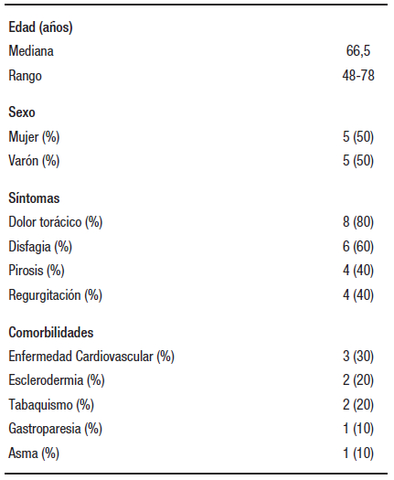 La tabla 1 muestra características demográficas y comorbilidades de los pacientes con EH. La mediana de edad fue de 66,5 años (rango 48-78 años). La relación hombre: mujer fue 1:1. El síntoma más frecuente fue dolor torácico, en un 80% (n = 8), seguido por disfagia esofágica en el 60% de los casos (n = 6), pirosis en el 40% (n = 4) y regurgitación en un 40% (n = 4). Debemos resaltar que algunos pacientes presentaron más de un síntoma. Las comorbilidades observadas fueron las siguientes: enfermedad cardiovascular 30% (n = 3), esclerodermia 20% (n = 2) y tabaquismo 20% (n = 2).