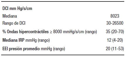 En la tabla 2, se observan las características manométricas. La mediana de DCI fue de 8023 mmHg/s/cm. La mediana del porcentaje de ondas hipercontráctiles mayores o iguales a 8000 mmHg/s/cm fue 35% (rango 2070 mmHg/s/cm). La mediana del IRP fue de 12 mmHg (rango 4-20 mmHg) y la mediana de presión del EEI fue de 20 mmHg (rango 11-53).