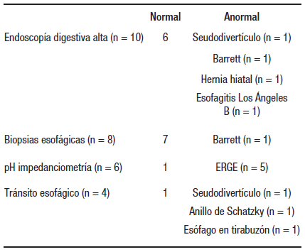En la tabla 3 se observan los resultados de otros estudios complementarios realizados en los pacientes con EH. De los 10 pacientes, en 6 se realizó pH impedanciometría off IBP y 5 (90%) presentaron reflujo ácido patológico. En el 40% de los pacientes, se realizó tránsito esofágico minutado, observándose en ellos: seudodivertículo (n = 1), anillo de Schatzky (n = 1) y esófago en tirabuzón (n = 1); el restante fue normal (n = 1). En todos los pacientes, se realizó una videoendoscopía digestiva alta (VEDA) evidenciando los siguientes resultados anormales: seudodivertículo (n = 1), hernia hiatal (n = 1), esofagitis Los Ángeles B (n = 1) y esófago de Barrett (n = 1). Se realizaron biopsias esofágicas en 8 pacientes: en un paciente se informó esófago de Barrett sin displasia y, en todos los casos, se descartó esofagitis eosinofílica.