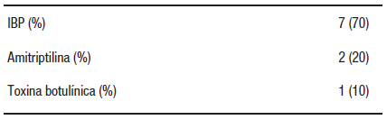 Todos los pacientes (n = 10) recibieron tratamiento con IBP a doble dosis por un período mínimo de 2 meses, y 70% (n = 7) presentó mejoría de los síntomas. Los pacientes que no respondieron a IBP (30%, n = 3) presentaron dolor torácico como síntoma dominante. Dos de los mismos fueron tratados con amitriptilina (12,5 mg/ día) y uno recibió una inyección de toxina botulínica en el cuerpo del esófago, con mejoría sintomática. (Tabla 4)