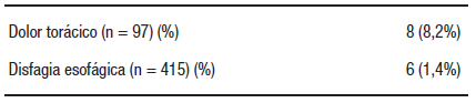 Los síntomas más comunes fueron: dolor torácico (80%) y disfagia esofágica (60%). Esto coincide con los hallazgos reportados en la literatura. (3,4,5,6