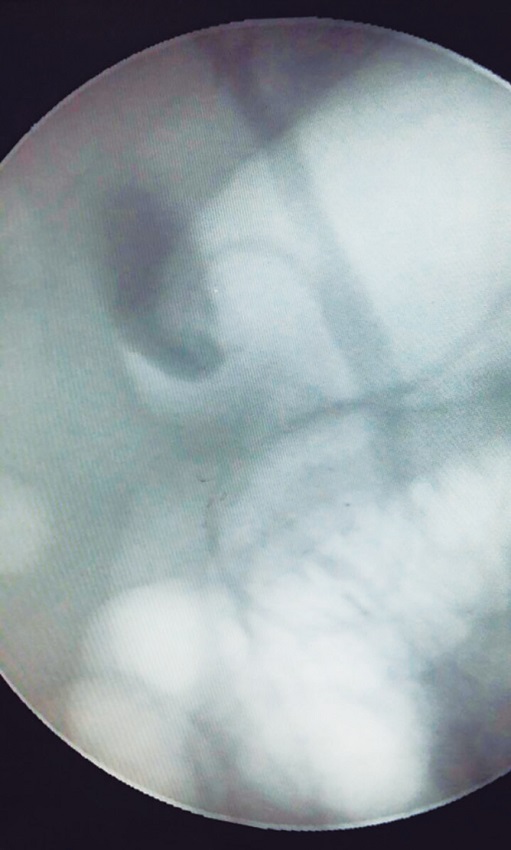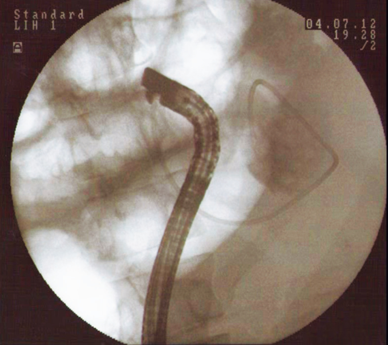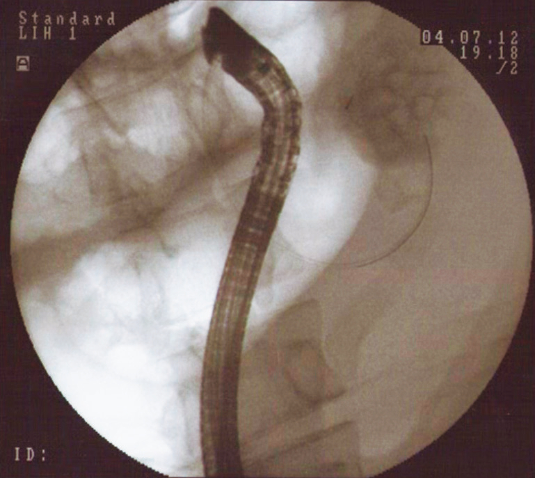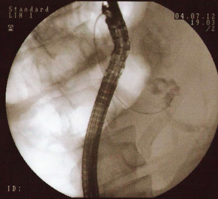 El procedimiento se llevó a cabo con endoscopio de visión lateral; se observó papila de aspecto normal, no se observo salida de cálculos luego del paso de la canastilla. Al contrastar el cístico se observo la presencia de un lito en su interior (Figura 1) con vesícula biliar completamente ocupada por cálculos (Figura 2). Se dejó un drenaje nasovesicular (Figura 3), se aspiró bilis para cultivo y se realizaron lavados reglados (Figura 4).